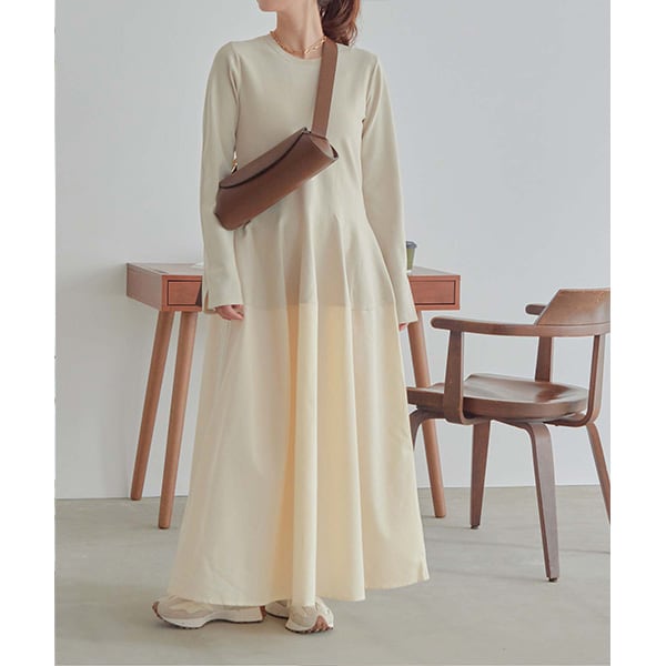・ニット素材と布帛素材がドッキングになったフレアワンピース。
