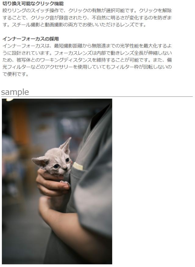 ピントが合っている部分は非常にシャープな写りを、それ以外の部分では心地よいボケ味を提供します。ポートレート撮影や低照度下での撮影にも適した、幅広い撮影用途にお使いいただけるレンズです。