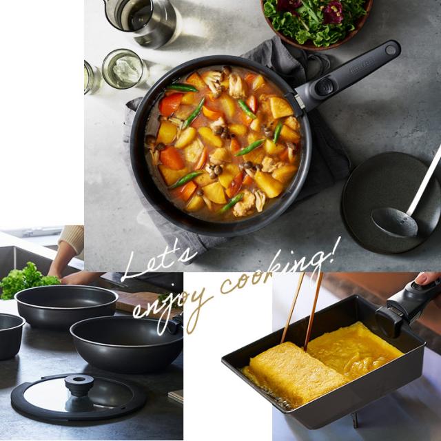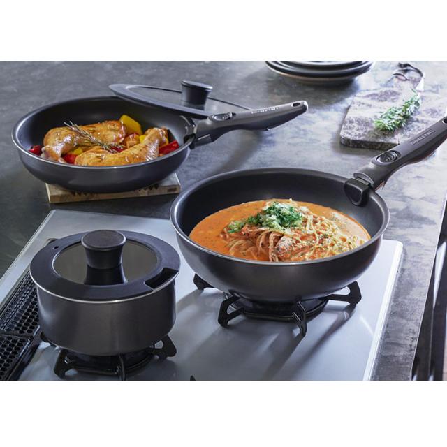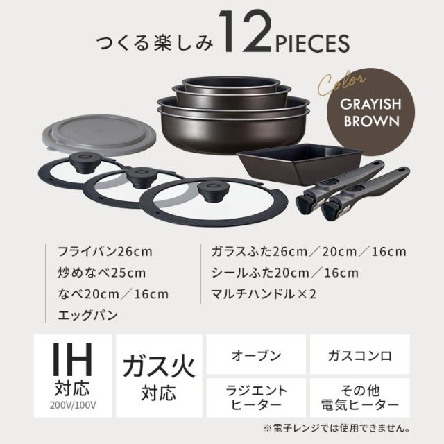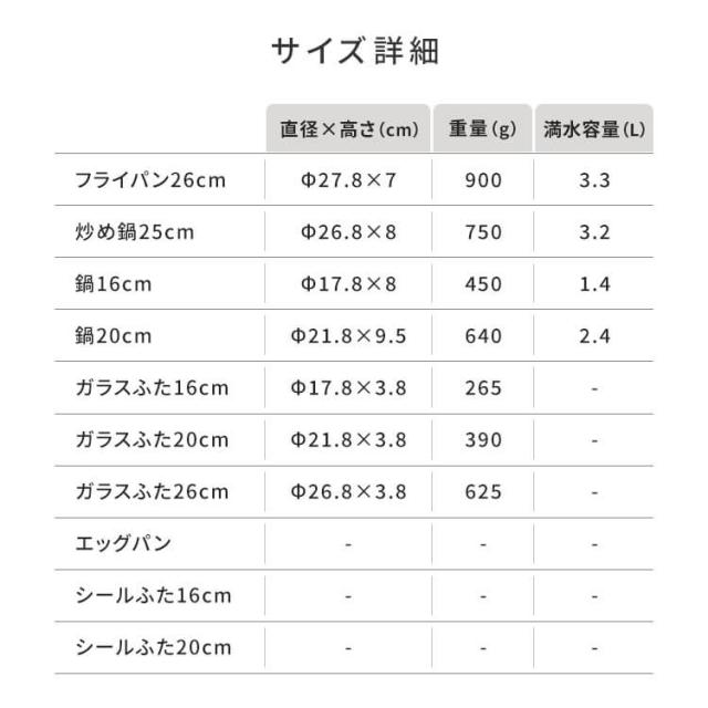 フライパン26cm、炒めなべ25cm、なべ20cm、なべ16cm、エッグパン、ガラスふた26cm、ガラスふた20cm、ガラスふた16cm、PEシールふた20cm、PEシールふた16cm、専用マルチハンドル×2