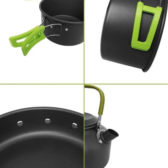 【安全な素材】キャンプや登山に適したクッカーセットはFDA認証も取得し、大鍋、フライパンとティーポットが食品衛生等級のアルミ材で作られ、軽量、丈夫、耐摩耗性で焦げ付き防止仕様処理し,熱の伝導が速くします。