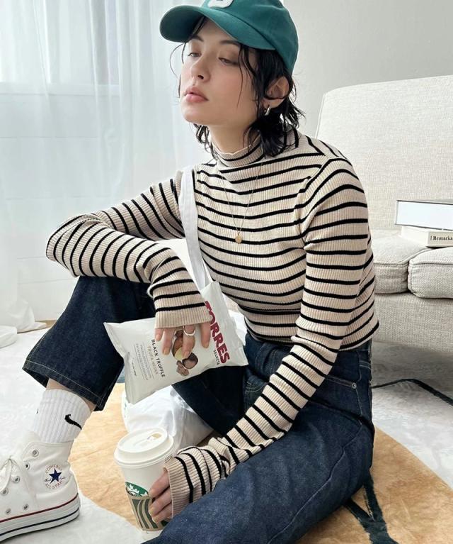 定番のハイネックリブニットにトレンドの指抜きデザイン!