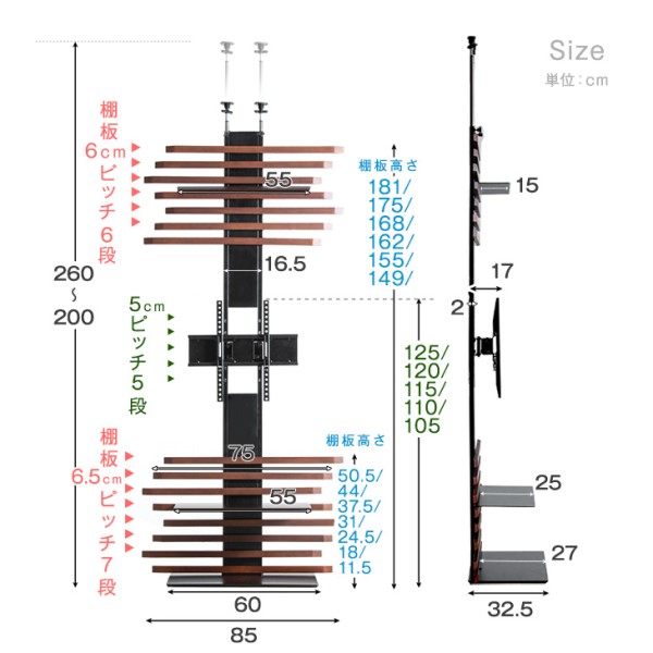 ■サイズ 外寸:幅60×奥行32.5×高さ200〜260cm