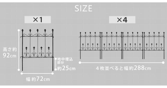 | 均整のとれた優雅な佇まいと、ヨーロッパの古城のような麗しさ。 プロのガーデナーが手がけたようなお庭に。 深い森の中に建つ石造りの古城…そんな雰囲気を漂わせる、繊細で風雅なデザインのアイアンフェンスです。 ちょっとさびしい玄関付近や、外壁沿いの味気ない花壇などに、華やかで高級感のあるフェンスをプラスすれば、立体感・躍動感が生まれます。 お庭を華やかにしたり、ハンギングを楽しんだり。 薔薇やクレマチスなどのツル性の植物をからませれば、よくあるメッシュフェンスのグリーンカーテンより、おしゃれで絵になる空間に。 エッジングに絶妙のサイズ感。 高さ92cmのミニタイプは、またぐことはできないけど、低めで見た目に圧迫感がない、絶妙の高さ。 立ち入ってほしくないエリアへのエッジングに最適で、工事や見積もりといった面倒な手間をかけずに、まるで造り付けのようなフェンスが設置できます。 幅72cmのワイドサイズなので、お庭をぐるっと囲みたい場合でも、少ない枚数でカバーでき、コストパフォーマンスに優れています。 |
