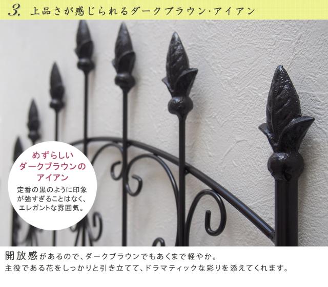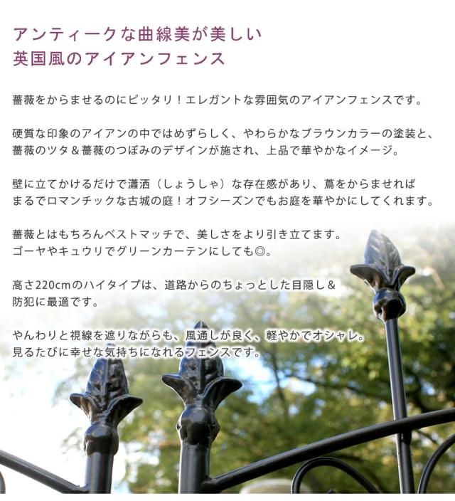 | アンティークな曲線美が美しい英国風のアイアンフェンス薔薇をからませるのにピッタリ! エレガントな雰囲気のアイアンフェンスです。 硬質な印象のアイアンの中ではめずらしく、やわらかなブラウンカラーの塗装と、薔薇のツタ&薔薇のつぼみのデザインが施され、上品で華やかなイメージ。 壁に立てかけるだけで瀟洒(しょうしゃ)な存在感があり、蔦をからませればまるでロマンチックな古城の庭! オフシーズンでもお庭を華やかにしてくれます。 薔薇とはもちろんベストマッチで、美しさをより引き立てます。 ゴーヤやキュウリでグリーンカーテンにしても◎。 高さ220cmのハイタイプは、道路からのちょっとした目隠し&防犯に最適です。 やんわりと視線を遮りながらも、風通しが良く、軽やかでオシャレ。 見るたびに幸せな気持ちになれるフェンスです。 |