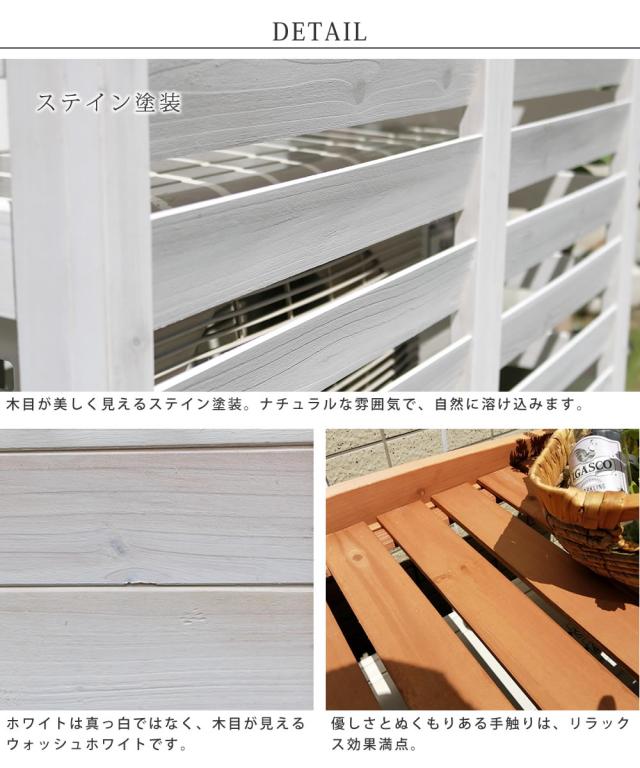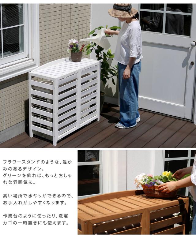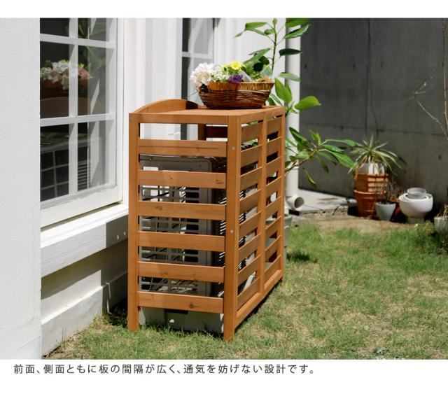 | ナチュラルスタイルのお庭づくりに。 どうしても生活感がにじみ出てしまうエアコン室外機は、おしゃれな室外機カバーで、目隠ししてしまいましょう。 天然素材の室外機カバーなら、センスのいいお庭にイメージチェンジできるだけでなく、上にプランターやガーデニング用品が置けるので、デッドスペースだった空間を有効活用できます。 広めの板幅で熱がこもりにくいだけでなく、板を上向きにすることで、周囲のグリーンに熱風が当たらないよう工夫しました。 直射日光が当たる位置に室外機があるなら、室外機カバーで日陰を作ることで、節電効果も期待できます。 |
