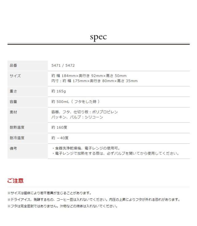 バルブをプッシュするだけで密閉できる500mLサイズのお弁当箱。食材の乾燥を防ぎ、パッキンによって汁もれもしづらい構造。保存容器としても使えて、食洗機や電子レンジも対応です。
