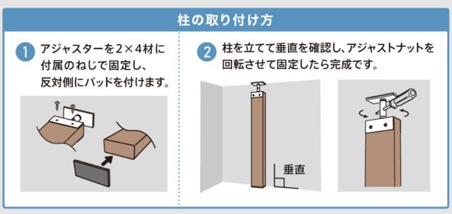 | 備考 | 適応する木材サイズ:市販の2×4材(38×89mm) 取付寸法:高さ275cmまで |