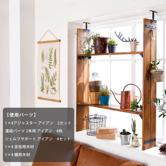 1×4木材を床と天井に突っ張り、DIYの基礎となる支柱を立てるためのアジャスターパーツです。アイアン製で、素材の質感を生かしたインテリアとして活用できます。シェルフサポート(棚受)やアイアンロッド(ハンガーポール)など、別売りのアイアンシリーズを組み合わせることで、統一感のある棚を手軽に作ることができます。