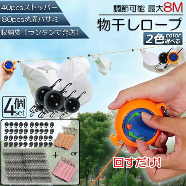 物干し 洗濯物干しロープ ナイロンロープ製 4個セット 収納に便利 長さ調節可能 キャンプ用物干し 屋外 屋内用 最大8メートルまで 持ち運びやすい 防風 滑り止め 収納袋付き 防風 長さ調整可能 ホテル旅行 出張 キャンプ ベランダ 裏庭 物干しロープ