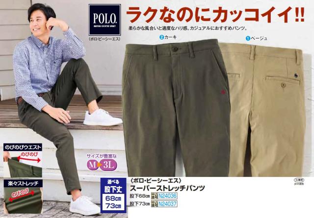 秋冬 ポロ・ビーシーエス スーパーストレッチパンツ 全2色 股下73cm ボトムス パンツ カーキ ベージュ ズボン メンズ 紳士服 シニア 男性 シニアファッション 50代 60代 70代 父の日 お父さん 緑 薄茶色 グリーン fri p24037