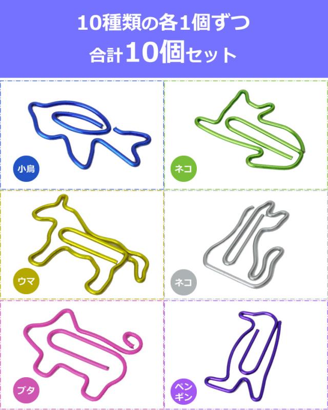 動物たちをモチーフにした10種類のデザインのクリップが各1個ずつの合計10個入りで