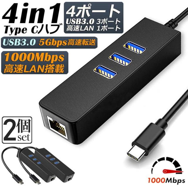 Type C ハブ 2個セット 1000Mbps USB C 有線LAN USB3.0 4ポート アダプター RJ45 変換アダプタ 5Gbps 高速 USB拡張 高速伝送 USB3.0ポート×3 ネットワークコンバーター ギガビット Hub MAC Wi