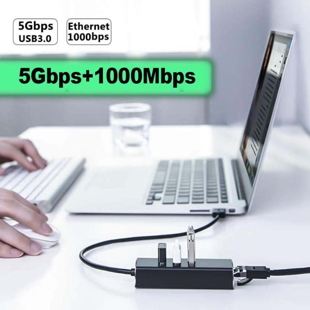 【4-in-1多機能USB C ハブ】本製品はコンピュータのUSBポートで、4ポートに1000M Ethernet LANポートX1、USB 3.0ポートX3のを搭載しています。拡張三つスーパースピードUSB 3.0ポートをお使いのデバイスにつなぐことで最大5Gbpsのデータ転送速度を実現して、HD動画も数秒で転送可能です。