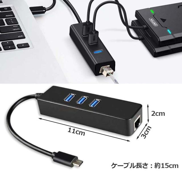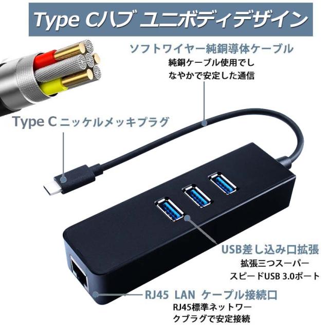 【4-in-1多機能USB C ハブ】本製品はコンピュータのUSBポートで、4ポートに1000M Ethernet LANポートX1、USB 3.0ポートX3のを搭載しています。拡張三つスーパースピードUSB 3.0ポートをお使いのデバイスにつなぐことで最大5Gbpsのデータ転送速度を実現して、HD動画も数秒で転送可能です。【挿すだけの操作で使用簡単】ドライバCD不要で、給電不要で軽量&ポータブルの設計を採用され、挿すだけの操作で簡単に使用できます。WIFI環境持たないところやType C周辺機器接続ための拡張に役立ちます。MacBook AirなどのType Cに繋いでEthernetネットワークに簡単に接続できます。カバに入れるサイズで、コンパクトなサイズに持ち運びに便利です。