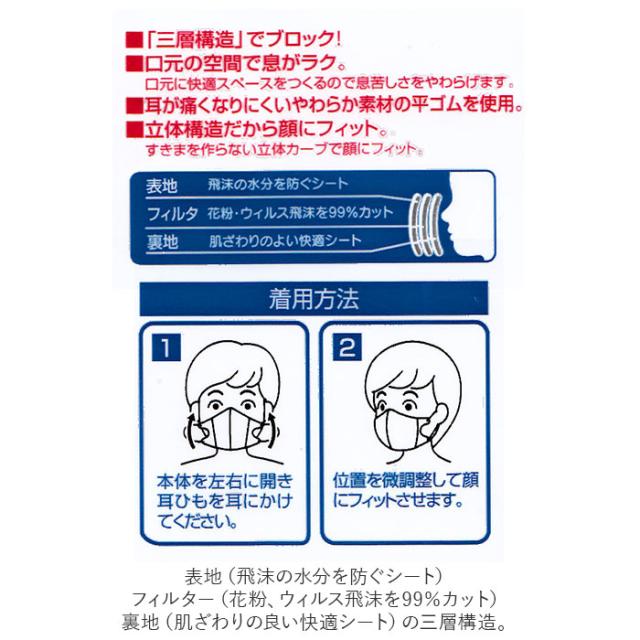 | 素材 | [表地]ポリエステル [フィルタ]ポリプロピレン [裏地]ポリプロピレン [耳ひも部]ポリエステル、ポリウレタン |
