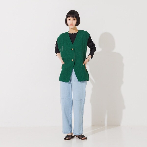深いvネックの先にある2つボタンに長めの丈感と全てのバランス感が絶妙な設計で、1枚織るだけで一気にオシャレ見え。