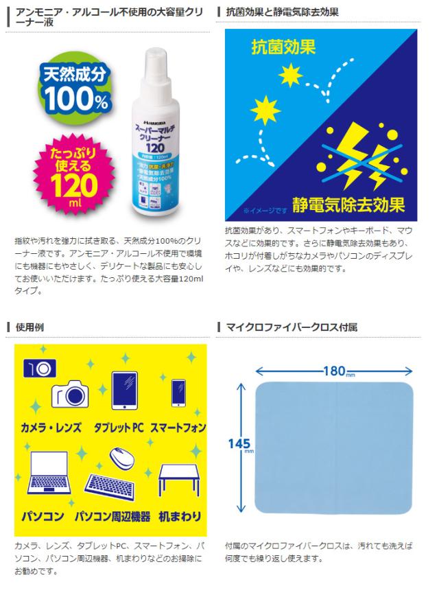 抗菌効果があり、スマートフォンやキーボード、マウスなどに効果的です。さらに静電気除去効果もあり、ホコリが付着しがちなカメラやパソコンのディスプレイや、レンズなどにも効果的です。