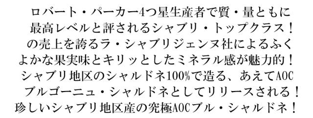 ロバート・パーカー4つ星生産者で質・量ともに最高レベルと評されるシャブリ・トップクラス!の売上を誇るラ・シャブリジェンヌ社によるふくよかな果実味とキリッとしたミネラル感が魅力的!シャブリ地区のシャルドネ100%で造る、あえてAOCブルゴーニュ・シャルドネとしてリリースされる!珍しいシャブリ地区産の究極AOCブル・シャルドネ!