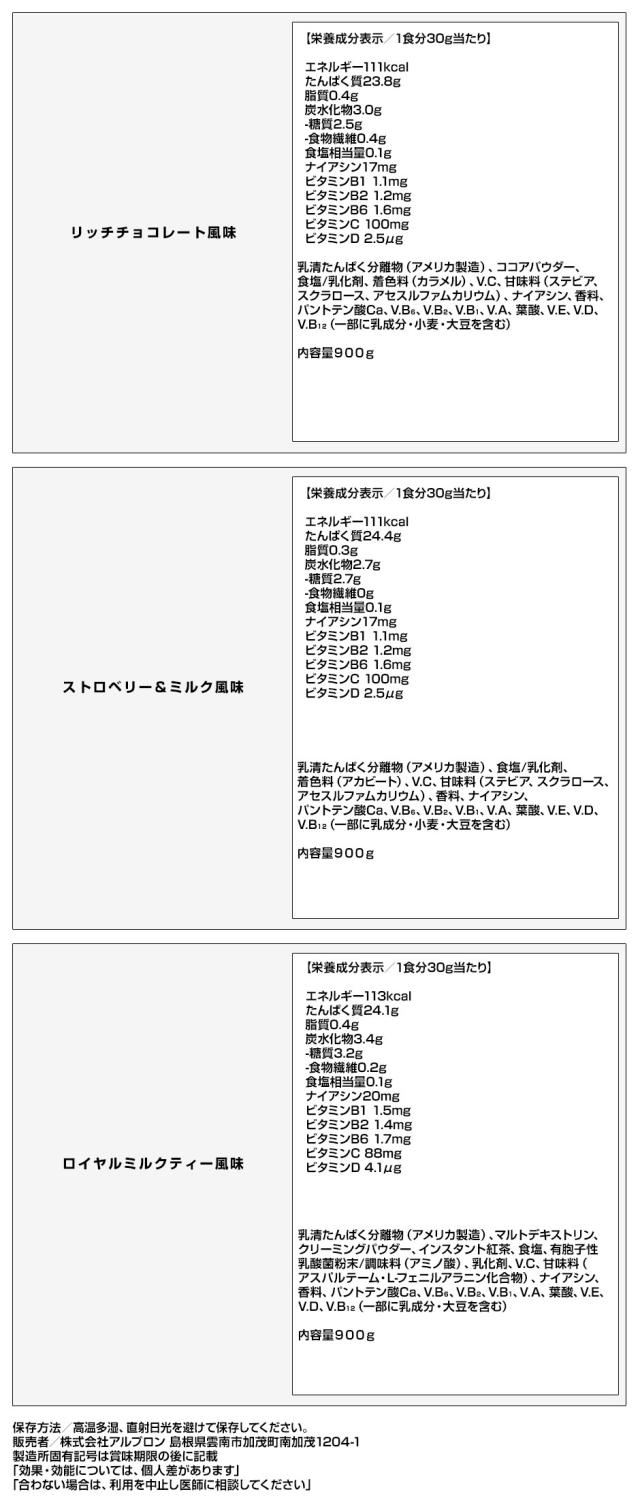 ※アルプロンでは、お客様に安定して商品をお届けするために 予告なく使用原材料を一部変更する場合がございます。 そのため、多少風味が変わる場合がございますが、 品質に問題はございませんのでご安心くださいませ。 原材料変更に伴い、栄養成分が変わる場合は 商品ページ栄養成分表、商品パッケージ裏面の栄養成分表も随時変更して参りますが ご注文のタイミングによって、栄養成分表が異なる場合がございます。 その際はお手元の商品パッケージ裏面の栄養成分表が 正確な数値となりますのでご確認頂きますようお願い申し上げます。 みなさまにより美味しい商品をお届け出来るよう アルプロン一同、日々努めてまいりますので 何卒ご理解賜りますようお願い申し上げます。