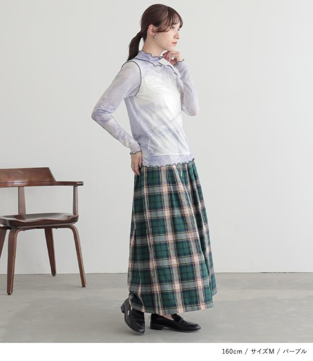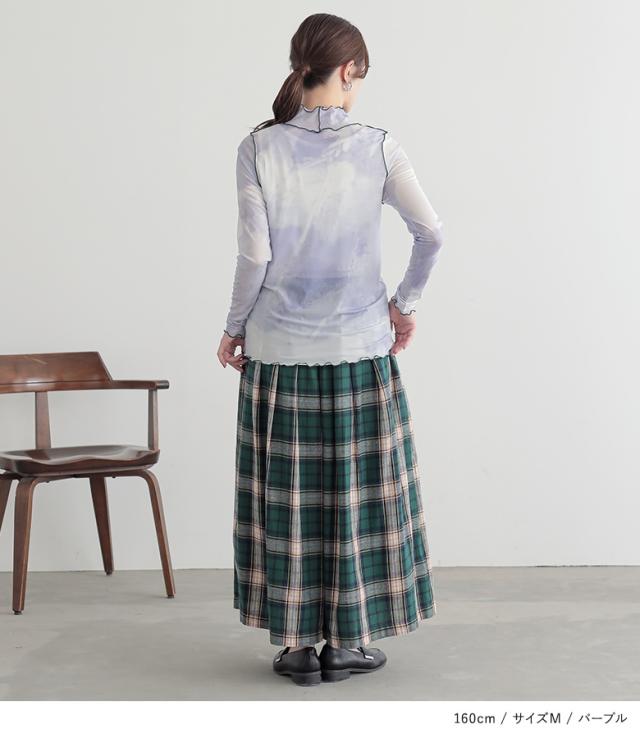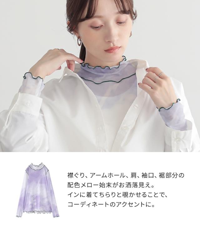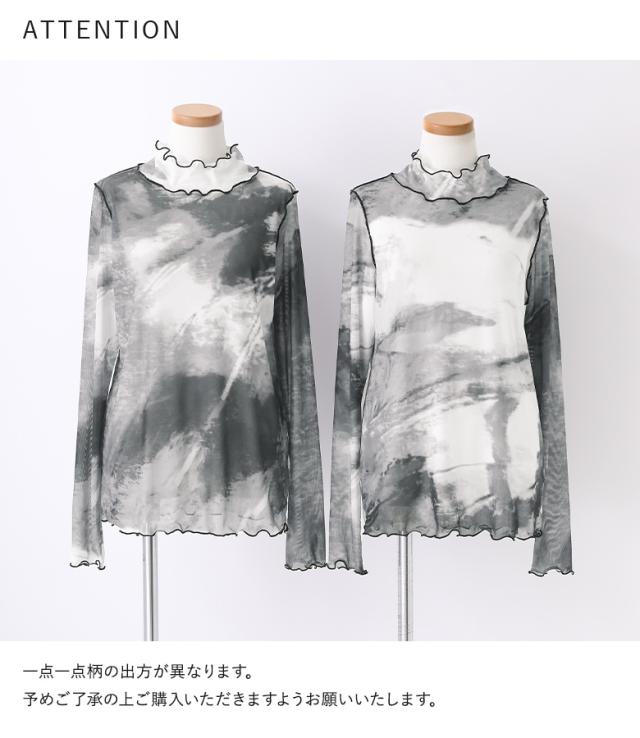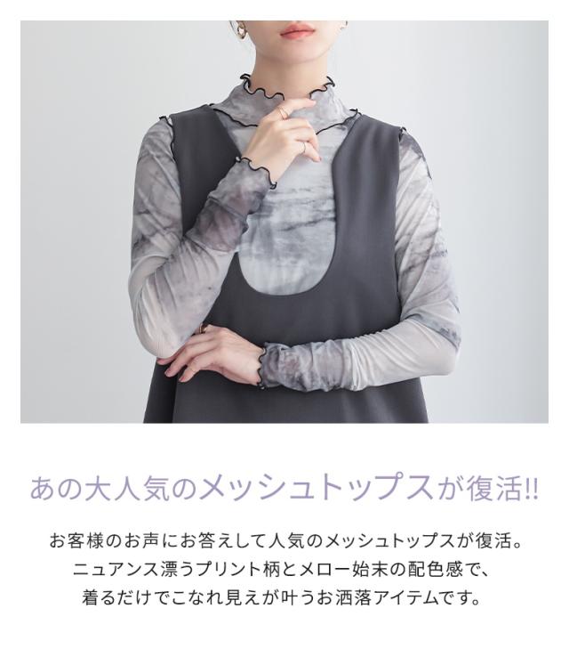 『ニュアンス柄ハイネックメッシュカットソー』 ※メール便可※【5】[カットソー レディース トップス ロンT 長袖 インナー ハイネック シアー 配色メロー メロウ 総柄 プリント レイヤード 重ね着 tjn0019]