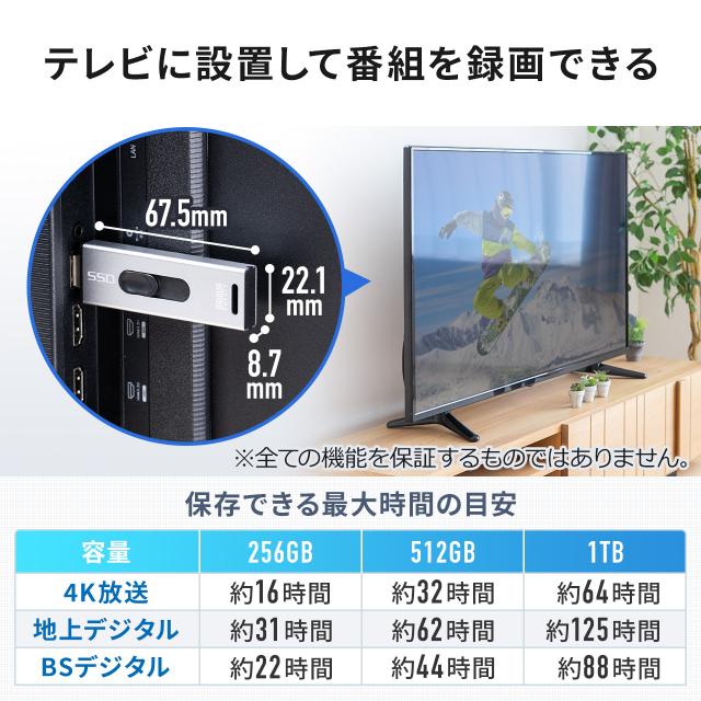 ●USB3.2 Gen2(USB3.1/3.0)で超高速データ転送に対応したポータブルSSDです。●テレビ録画機能のあるテレビと接続すれば、番組を録画・再生することができます。