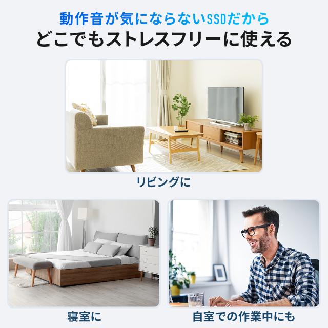 ※すべての状況・環境で、SSD/データ/外装ケースが破損しないことを保証するものではありません。また、動作中のSSDの破損を防ぐものではありません。ドライブを故意に落下させたり、衝撃を加えないで下さい。