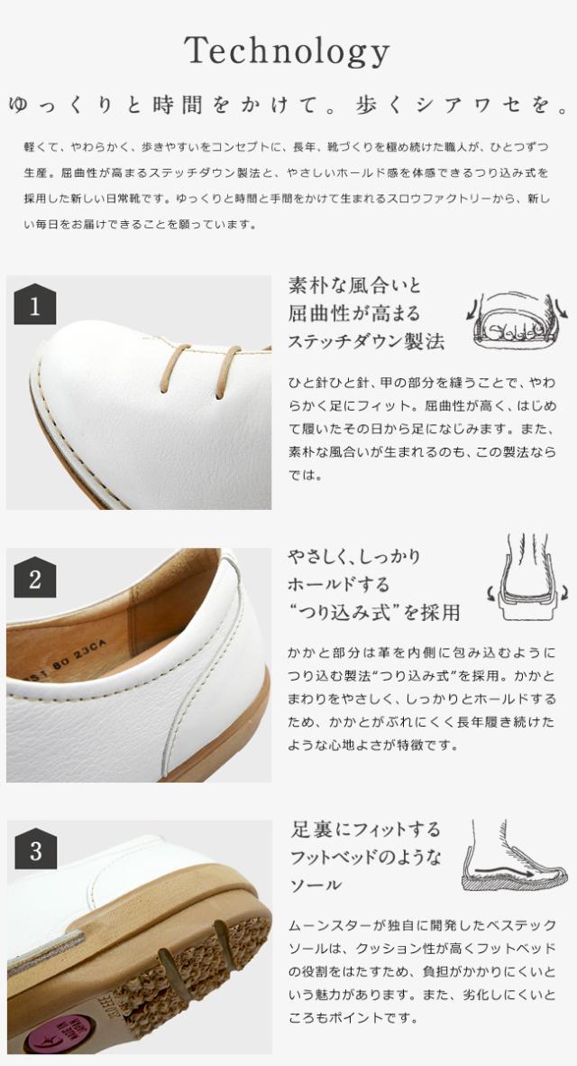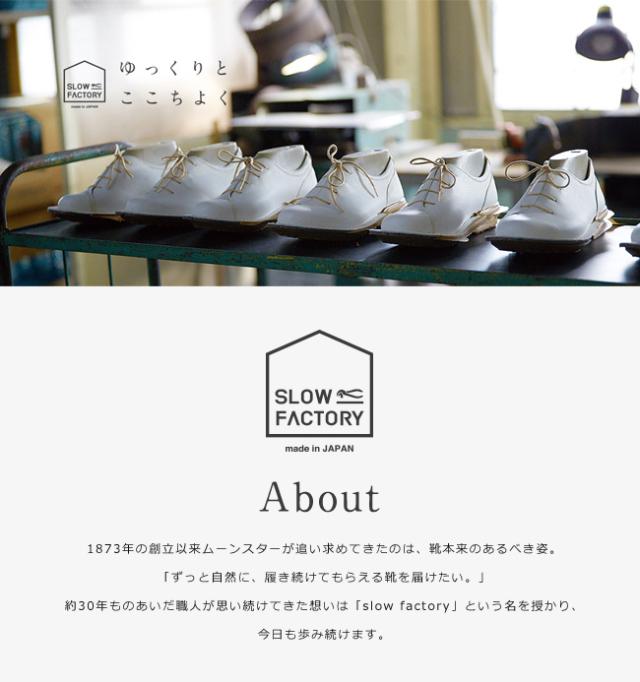 ムーンスター「SlowFactory」は1956年から革靴生産を担ってきた佐賀の工場でゆっくり時間をかけ丁寧に作った靴です。甲の部分はやわらかくフィットし屈曲性が良いステッチダウン製法、かかと周りはしっかりホールドするために革を内側に包み込むつり込み式になっています。ソールは足なりの形に立体的にフィットするPUダイレクト製法です。ソールそのものがフットベッドの役割をはたすので足にやさしくここち良いつくりです。履きやすいワンストラップタイプです。ヒールの高さは3.0cmで、重量は23.0cmで片足約270gです。【ベステック(R)ソール】ウレタンの劣化しやすい弱点を大きく改善した素材で、軽量性、弾力性、防滑性に富んだソールです。【足なり設計】足の特性に合わせて足裏にフィットするため、負担がかかりにくい設計です。