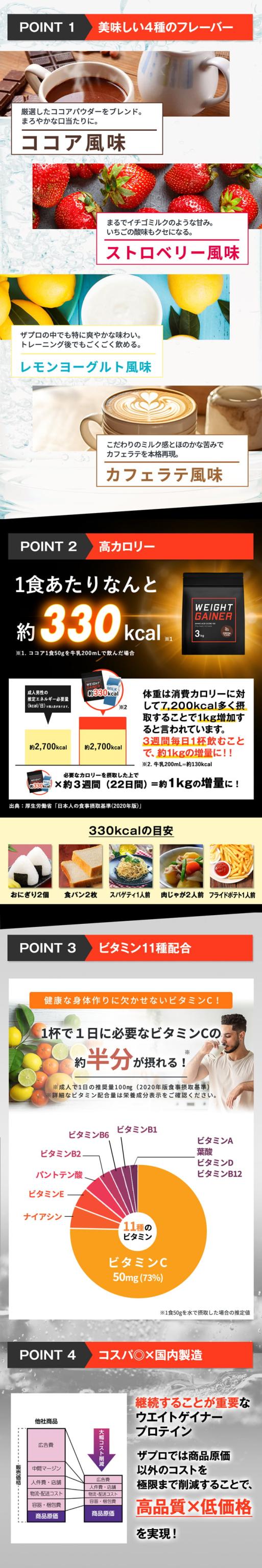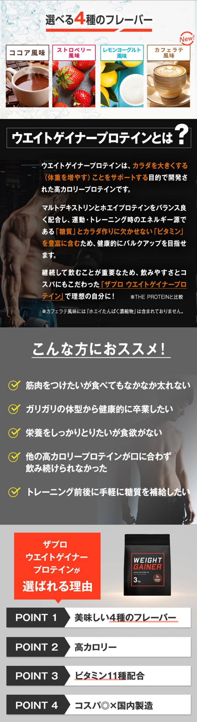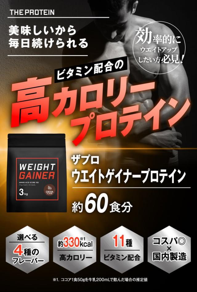 ウエイトゲイナープロテイン 3kg 3種のフレーバー 高カロリー ホエイ ホエイプロテイン 大容量 ビタミン 糖質 男性 女性 ザプロ ココア ストロベリー レモン ヨーグルト バルクアップ ウエイトアップ 筋トレ 増量 筋肉増強 美味しい 太るプロテイン
