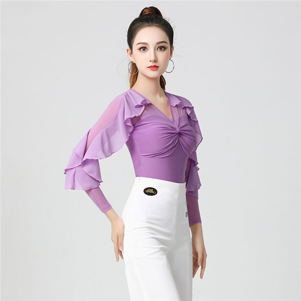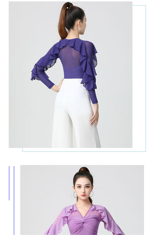 バレエ練習着 大人用 トップス レディース 社交ダンス ダンスウェア Vネック ラテン ダンストップス 袖あり 長袖 パープル フリル ラバティンカラー 女性 社交ダンス衣装 上着 競技着 モダン ダンス衣装 上着 ダンス 社交 練習着 ワルツ チャチャチャ レッスン着 ステージ 衣装 演出着 dm561c0c0la