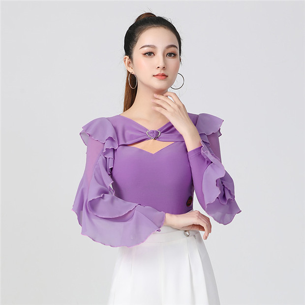 バレエ練習着 大人用 トップス レディース 社交ダンス ダンスウェア ラテン フリル ダンストップス 袖あり 女性 社交ダンス衣装 上着 競技着 モダン ダンス衣装 上着 ダンス 社交 練習着 ワルツ チャチャチャ レッスン着 ステージ 衣装 演出着 dm565c0c0la