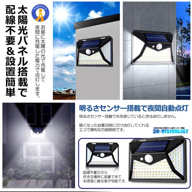 ソーラーパワーセンサー屋外ライト超大容量で高輝度の118LED搭載大量のLEDと広角270度の照明角度で設計された屋外ガーデン用のソーラーパワーモーションセンサーライトです3面発光で広角照射3面にLED搭載でより広角&強力に照射可能です。太陽光パネル搭載で配線不要&設置簡単お昼に太陽の光で充電して夜間に充電した電力で点灯します。配線不要だから好きな場所に設置できてお洒落に飾る事が可能です。明るさセンサー搭載で夜間に自動点灯人感センサー3モード切替可能送料無料