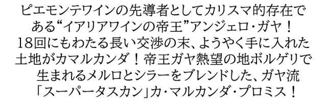 ピエモンテワインの先導者としてカリスマ的存在である“イアリアワインの帝王”アンジェロ・ガヤ!18回にもわたる長い交渉の末、ようやく手に入れた土地がカマルカンダ!帝王ガヤ熱望の地ボルゲリで生まれるメルロとシラーをブレンドした、ガヤ流「スーパータスカン」カ・マルカンダ・プロミス!