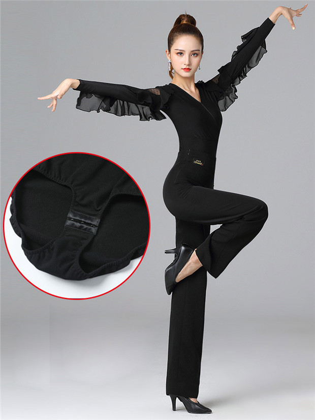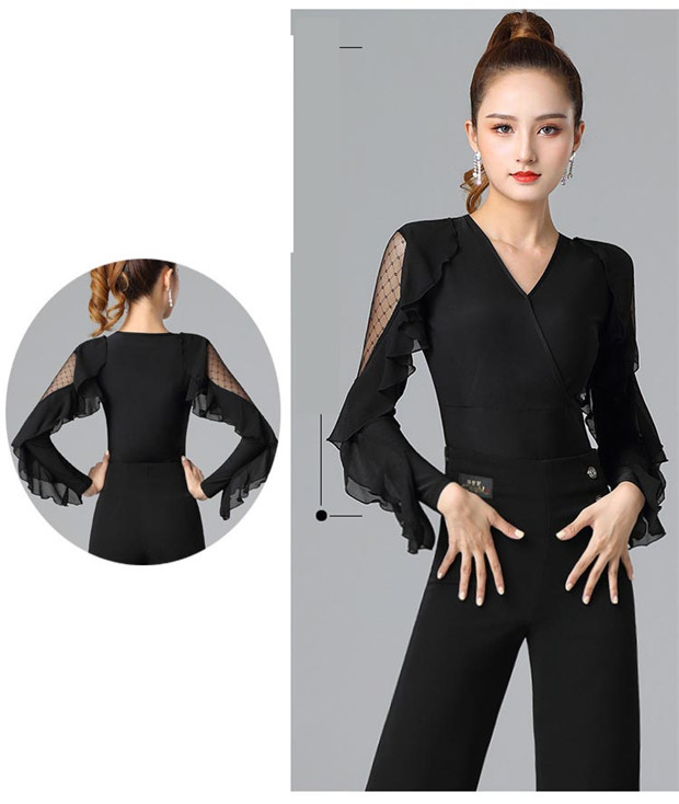 【送料無料】バレエ練習着 大人用 トップス レディース 社交ダンス ダンスウェア ラテン ダンストップス 袖あり 長袖 フリル ラバティンカラー 女性