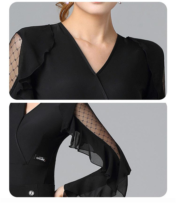 バレエ練習着 大人用 トップス レディース 社交ダンス ダンスウェア ラテン ダンストップス 袖あり 長袖 フリル ラバティンカラー 女性 社交ダンス衣装 上着 競技着 モダン ダンス衣装 上着 ダンス 社交 練習着 ワルツ チャチャチャ レッスン着 ステージ 衣装 演出着 dm567c0c0la