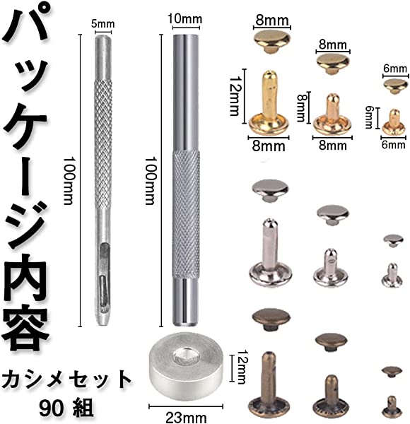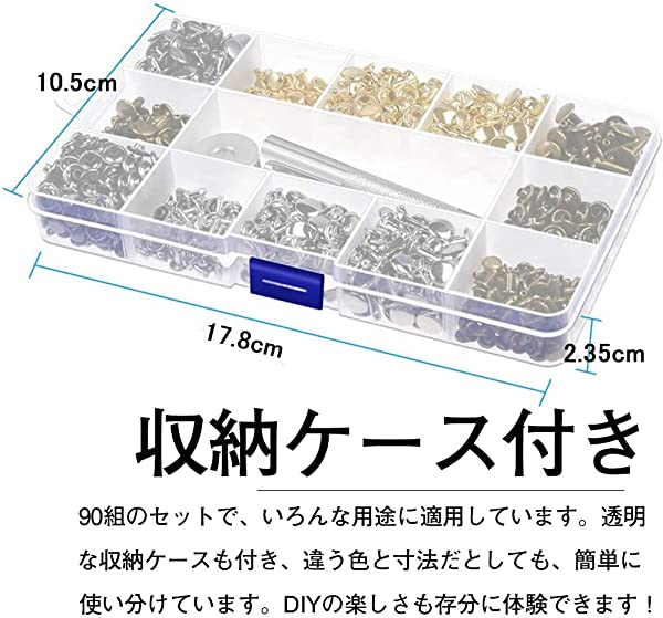 【パッケージ内容】カシメセット 90組;3サイズ (6 6mm/8 8mm/8 12mm)各30組;3種色(ゴールド/シルバー/ガンメタル);工具 3(穴あけポンチ 1/打ち棒 1/打ち台 1);収納ケース 1(ケースサイズ:17.8×10.5×2.35cm)