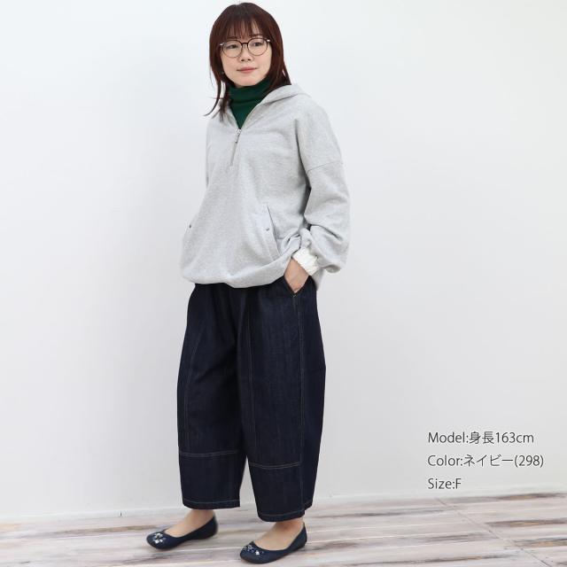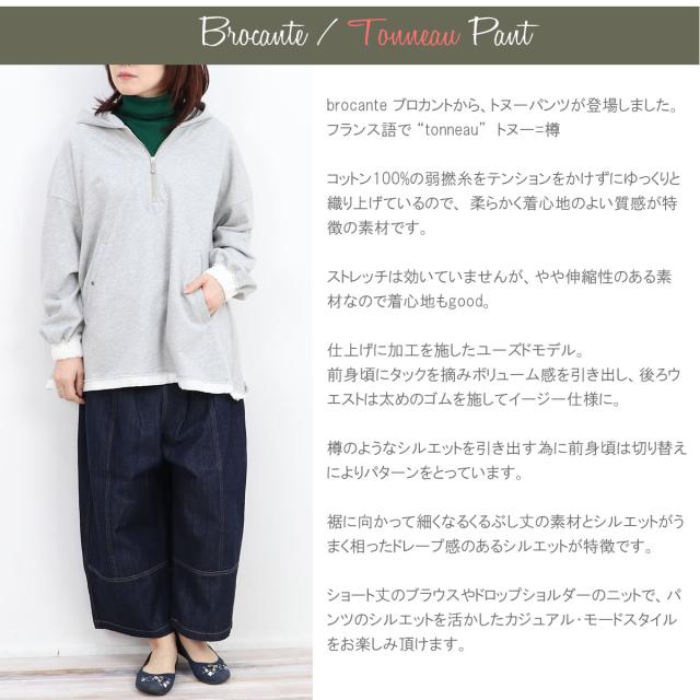 ■ ブロカント Brocante 商品説明 フランス語で “tonneau” トヌー=樽 コットン100%の弱撚糸をテンションをかけずにゆっくりと織り上げているので、 柔らかく着心地のよい質感が特徴の素材です。 ストレッチは効いていませんが、やや伸縮性のある素材なので着心地もgood。 仕上げ洗いを施したワンウォッシュデニム。 前身頃にタックを摘みボリューム感を引き出し、後ろウエストは太めのゴムを施してイージー仕様に。 樽のようなシルエットを引き出す為に前身頃は切り替えによりパターンをとっています。 裾に向かって細くなるくるぶし丈の素材とシルエットがうまく相ったドレープ感のあるシルエットが特徴です。 ショート丈のブラウスやドロップショルダーのニットで、パンツのシルエットを活かしたカジュアル・モードスタイルをお楽しみ頂けます。 ※フリーサイズで着用できます。 |