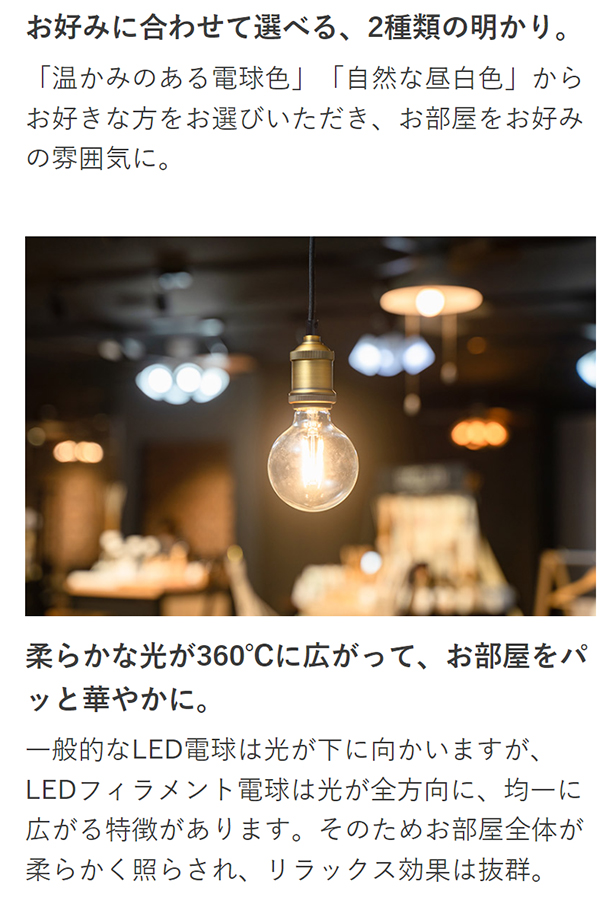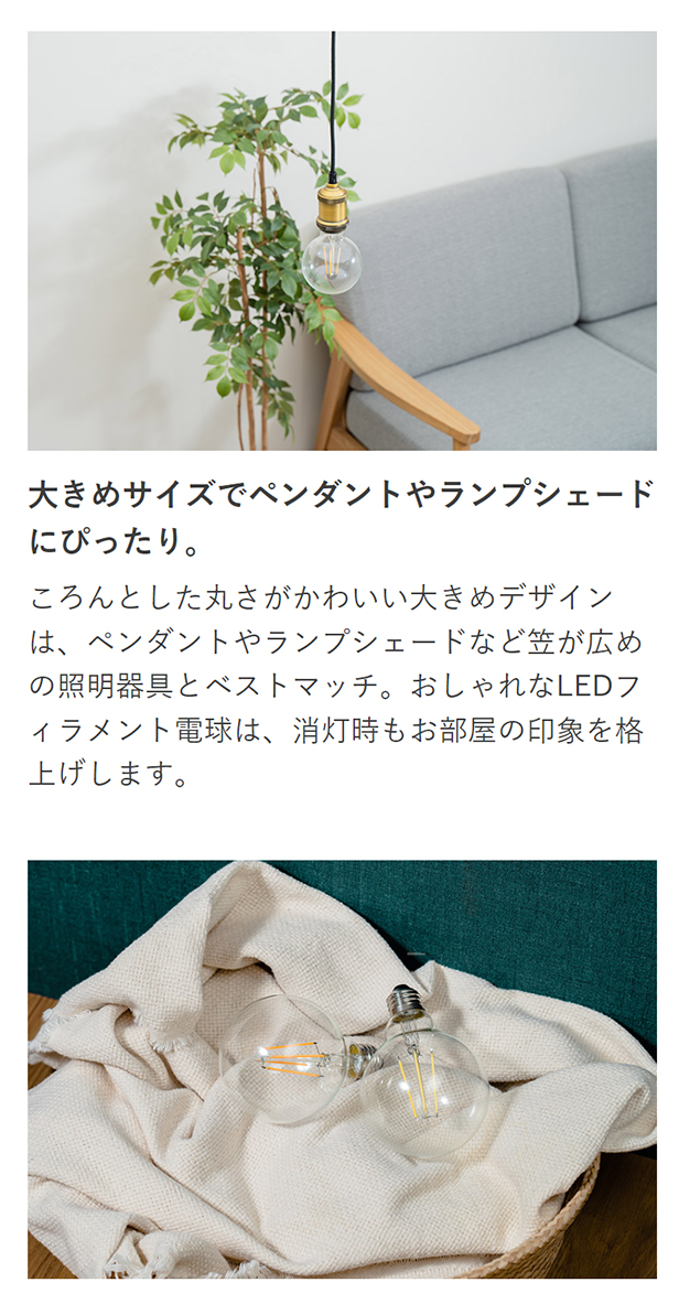 いつものお部屋を、オレンジと白の優しい光でリラックス空間にしてくれるLEDフィラメント電球。明るさは白熱電球の60w相当で、お部屋の全方向に明るさを届けます。インテリア性が高く、大きめのデザインはペンダントなどの照明器具にぴったり。長寿命なので取り換えが面倒な高い場所にある照明にもオススメです。