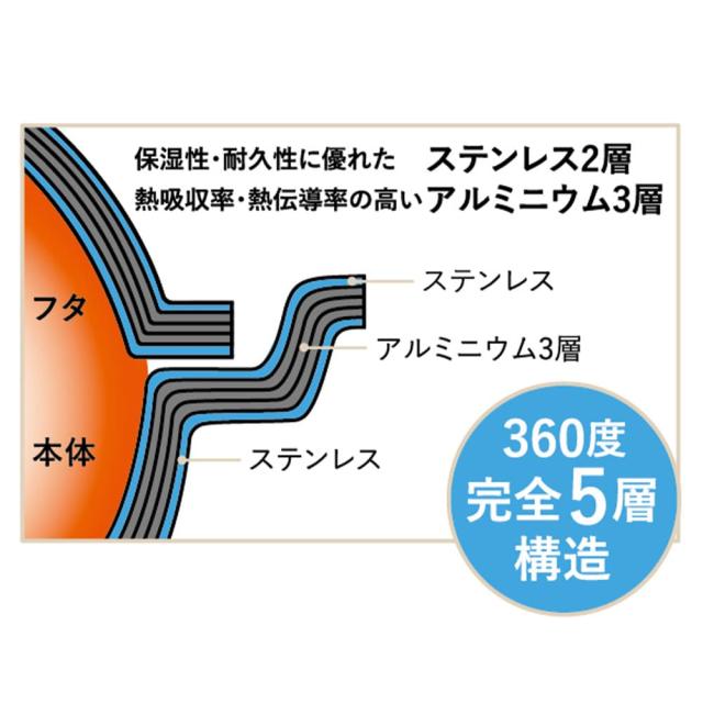 保温性に優れたステンレス2層と熱吸収・熱伝導の高いアルミニウム3層の360度完全5層構造で熱まわりがよく、熱ムラがない理想的な対流を実現しました。 | 蒸気を閉じ込め、旨みを逃がさない