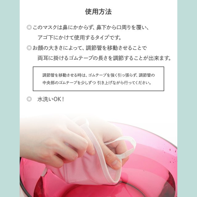 | ご使用方法 | このマスクは鼻にかからず、鼻下から口周りを覆い、アゴ下にかけて使用するタイプです。お顔の大きさによって、調節管を利用させるときは、ゴムテープを強く引っ張らず、調節管の中央部のゴムテープを少しずつ引き上げながら行ってください。 |