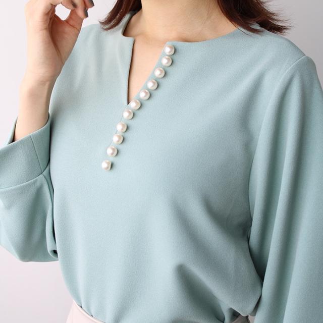 パール調ビーズ付キーネックブラウス