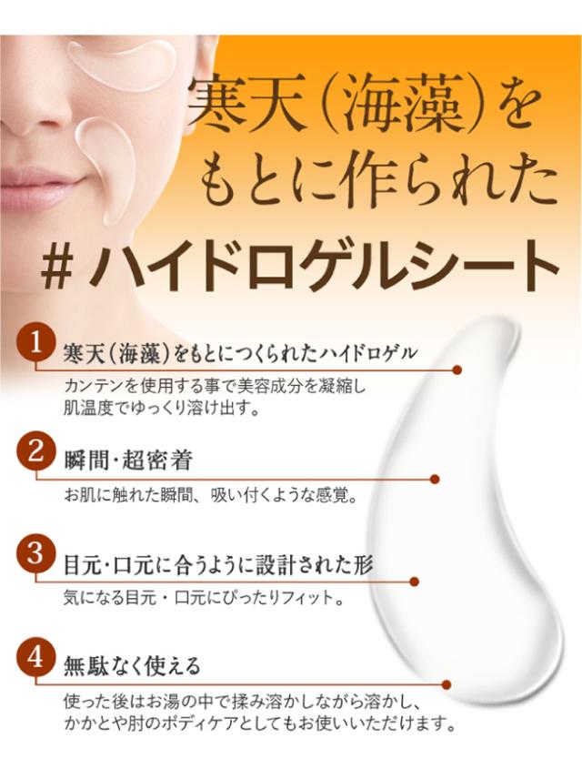 ほうれい線や目元のしわなどに、貼るだけでしっかりぷるぷる保湿ケアができる部分パック。本品は厚みのある「寒天」タイプを採用。コットンやシリコンとは違い、寒天は重量の100倍の水分を抱え込む保水力を誇ります。