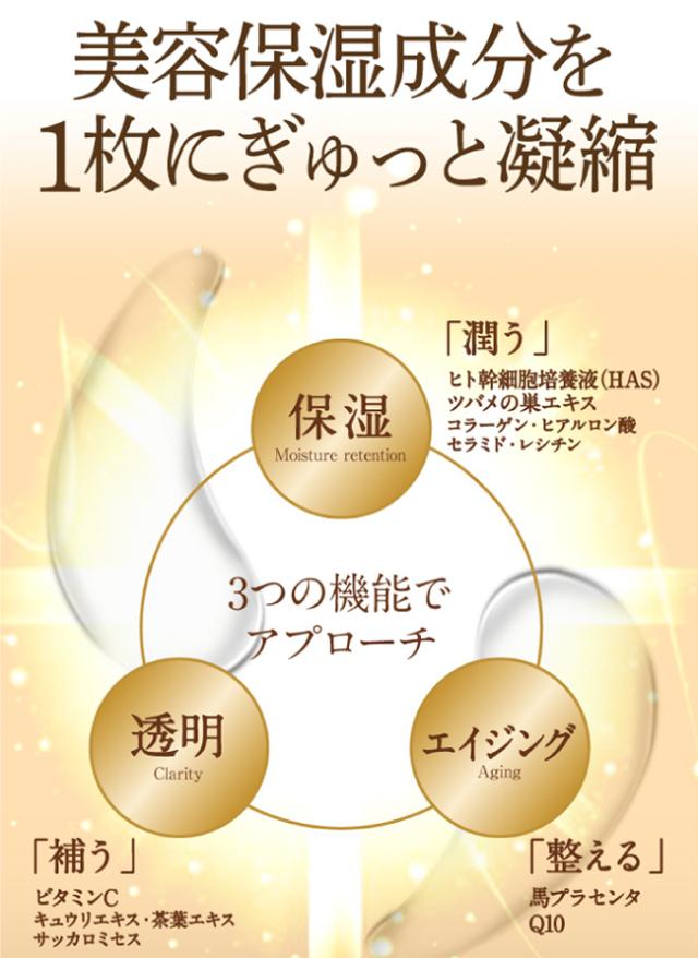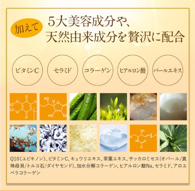 | 成分 | 水、グリセリン、トチャカ、ローカストビーンガム、キサンタンガム、1,2−ヘキサンジオール、フェノキシエタノール、PEG−60水添ヒマシ油、DPG、メチルパラベン、変性アルコール、グアーガム、カンテン、酢酸トコフェロール、BG、デキストリン、塩化K、グルコース、EDTA−2Na、プロピルパラベン、香料、チャ葉エキス、ツボクサエキス、イタドリ根エキス、オウゴン根エキス、カンゾウ根エキス、カミツレ花エキス、ローズマリー葉エキス、TEA、カルボマー、ヒト脂肪細胞順化培養液エキス、プラセンタエキス、セラミドNP、アスコルビン酸、ヒアルロン酸Na、加水分解コラーゲン、アナツバメ巣エキス、加水分解エラスチン、オリーブ果実油、アロエベラ葉、キュウリ果実エキス、サッカロミセス/真珠母貝培養溶解質液、サッカロミセス培養液、水添レシチン、アラントイン、エチルヘキシルグリセリン、ユビキノン、トリ(カプリル酸/カプリン酸)グリセリル、(クエン酸/乳酸/リノール酸/オレイン酸)グリセリル、イソセチルアルコール、トロポロン、ポリソルベート60、カプリリルグリコール |