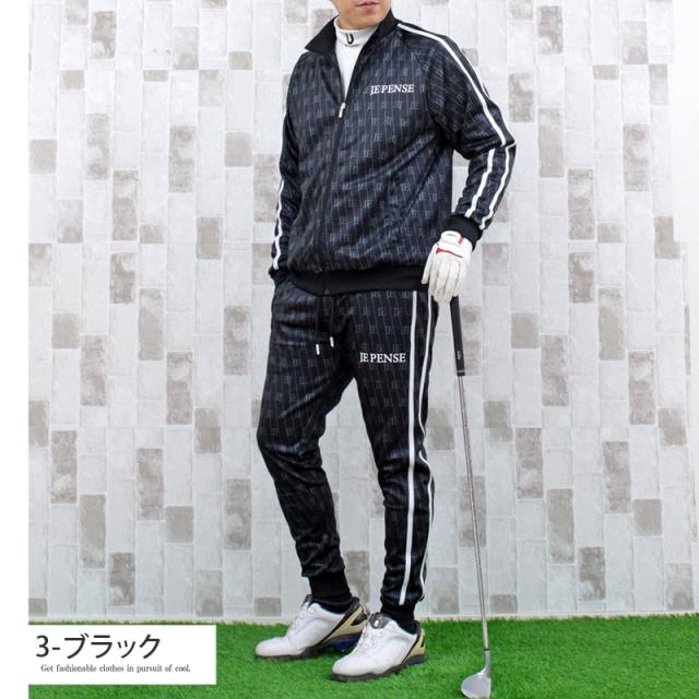 送料無料 ゴルフ セットアップ メンズ 上下セット ゴルフウェア 総柄 ロゴ ゴルフパンツ ジップアップ ジャケット ブルゾン ライン ジョガーパンツ おしゃれ 秋冬 春夏