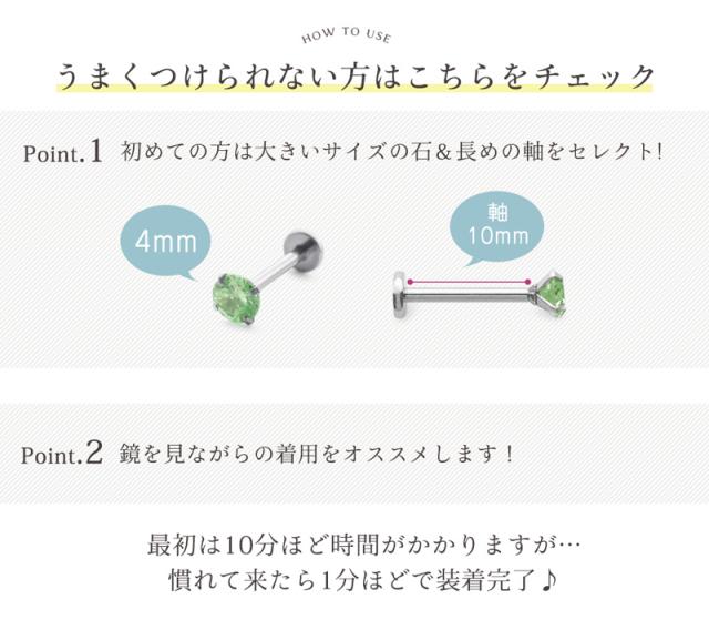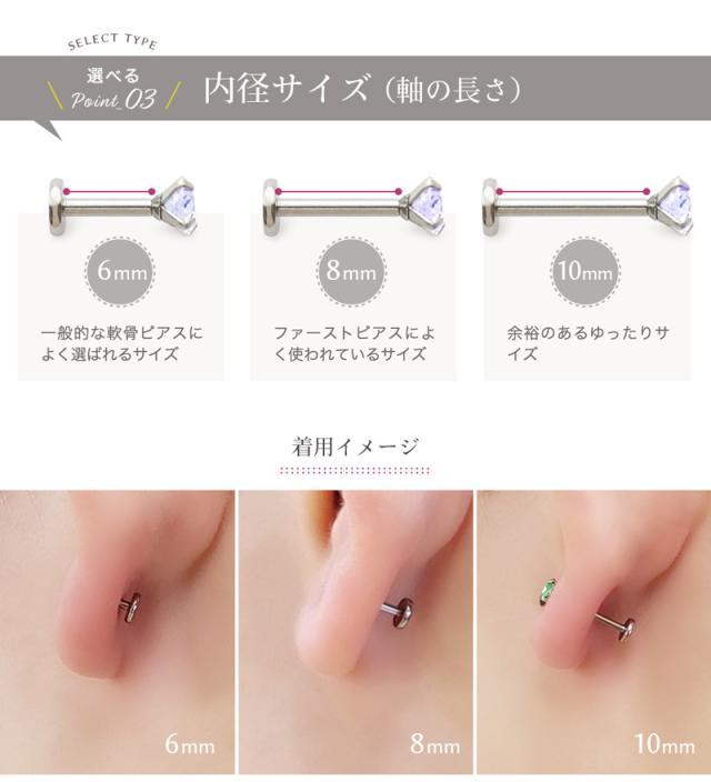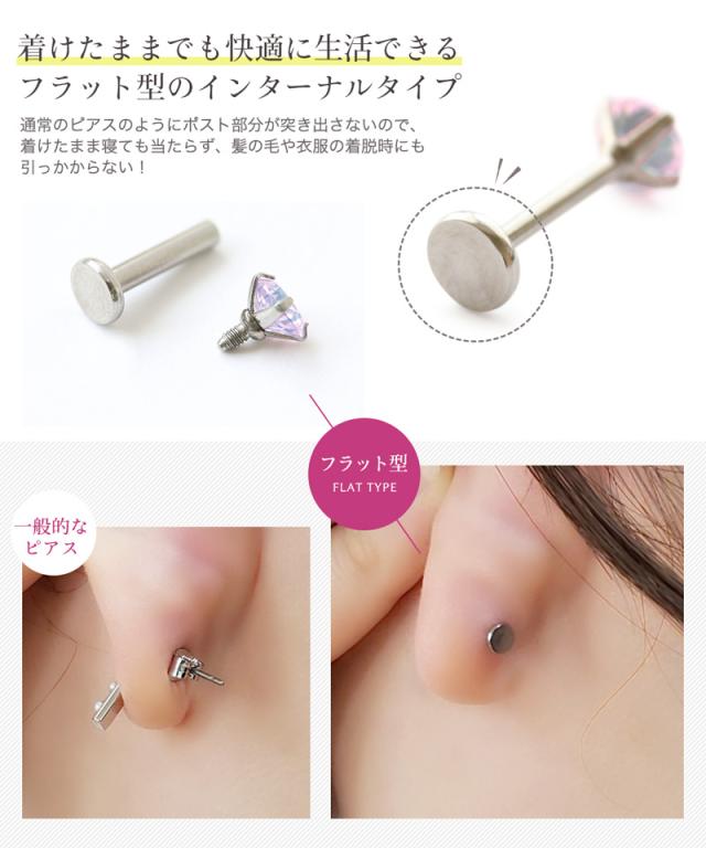 | キラリと輝くキュービックジルコニアのボディピアスです。 着けたままでも快適に生活できるフラット型のインターナルタイプで、 通常のピアスのようにポスト部分が突き出さないので、着けたまま寝ても当たらず、 髪の毛や衣服の着脱時にも引っかからない嬉しい仕様! また、金属アレルギーを起こしにくく、お肌に優しいサージカルステンレスなので、 サビや変色にも強く、安心してお使いいただけます。 ゲージ(軸の太さ)や内径(軸の長さ)、石の大きさも選べる豊富なラインナップです! | |