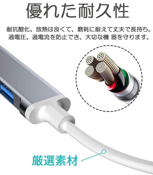 【耐久性抜群】アルミ合金製ハブは堅牢性が十分、全体的な質感にも高級感があります。また、ケーブルやポートに強化設計や耐熱設計が施されており、放熱性能もしっかり整って、過電圧・過電流・短絡を防止できます。安心して使用ができます。