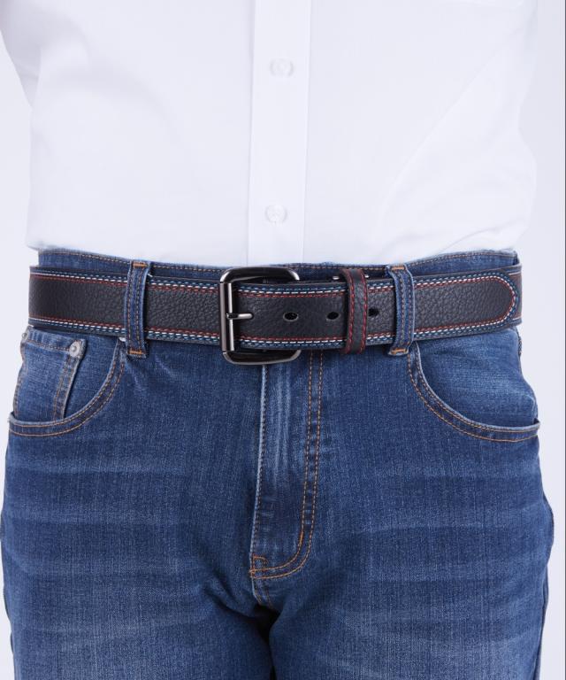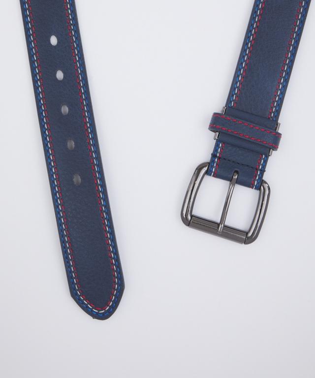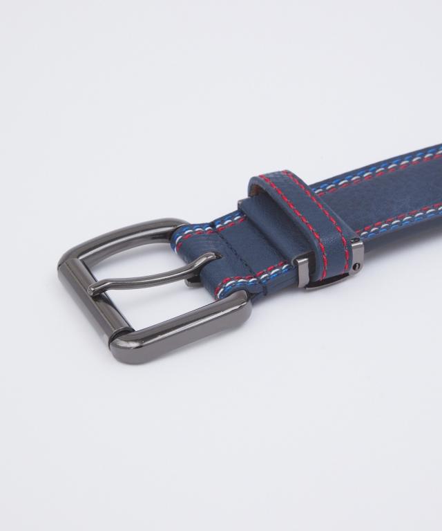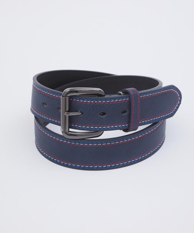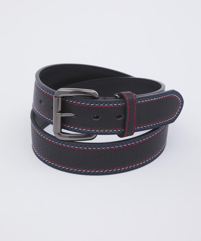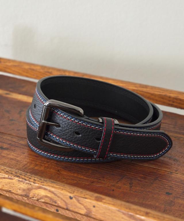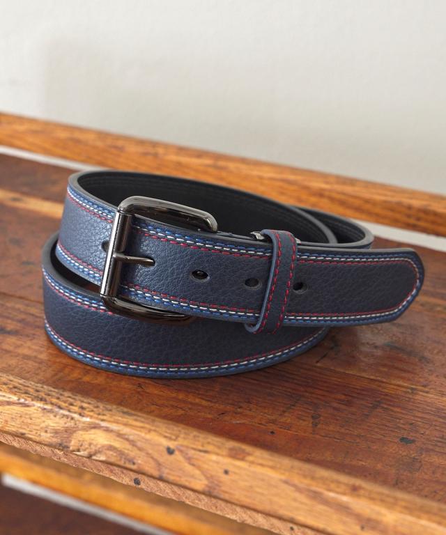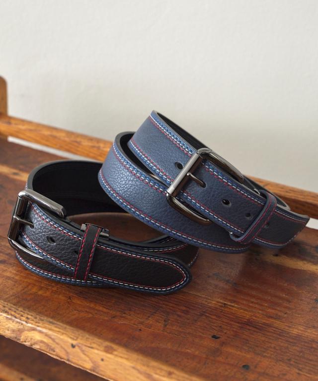 トリコロールカラーのステッチがデザインのアクセントとして効いたカジュアルベルト。オーソドックスなブラックとネイビーの2色をご用意しました。ベルトはカットしてサイズ調整が可能です。