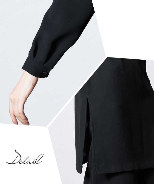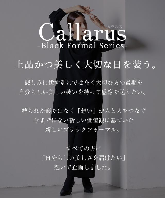 【Callarus(カラルス)】〜forBlackFormal〜まっすぐブレない美しさで人々を魅了する花“callalily”とラテン語で輝くという意味の“clarus”を合わせた造語がブランド名の由来です。<自分らしく上品で美しい装いを大切にする方へ>縛られたカタチではなく、「想い」が人と人をつなぐシーンにもテイストにも年齢にも縛られない自由な着こなしを実現する新しいブラックフォーマル。 こだわりポイントシーンを選ばないという今までにない価値観に基づいた新しいロング丈ブラウス+パンツセットアップロング丈