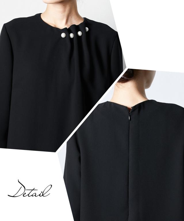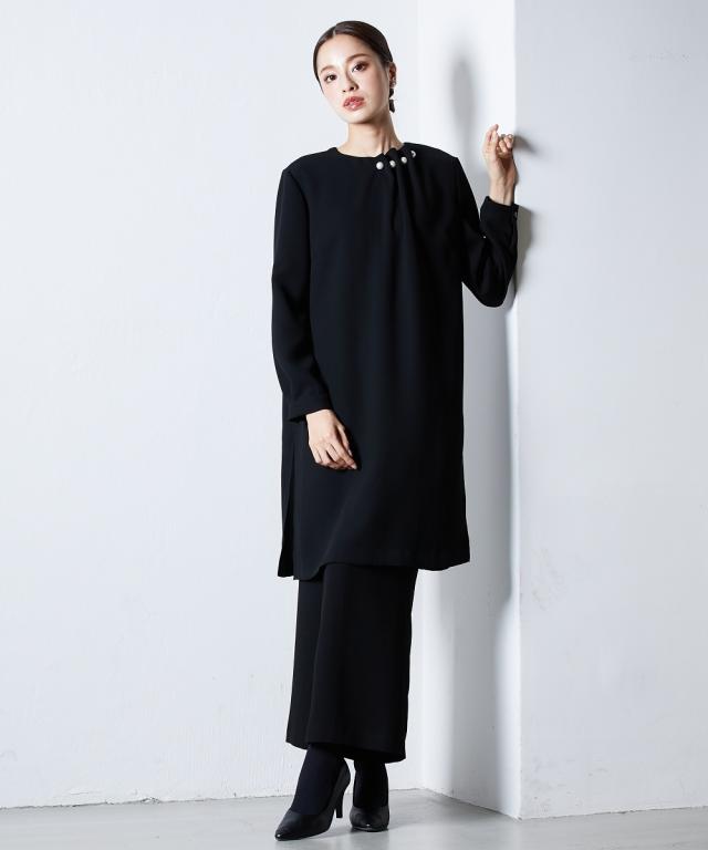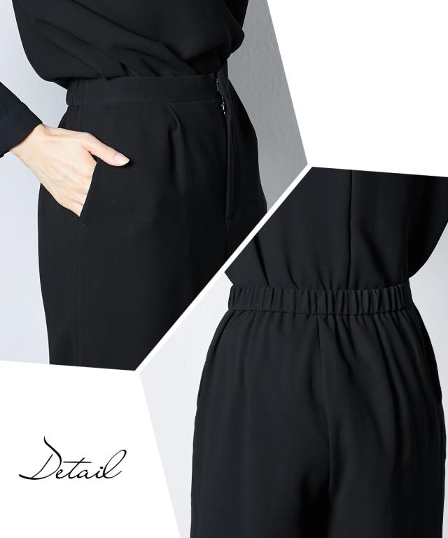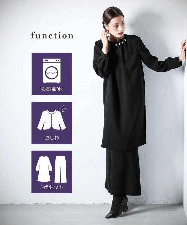 【喪服・礼服】 Callarus 日本製生地使用洗える防しわパール調デザインロングブラウス+ワイドパンツセットアップ