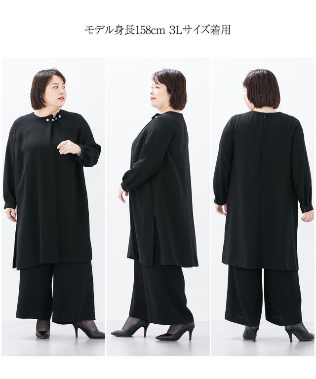 喪服 スーツ パンツ 大きいサイズ レディース 礼服 Callarus 日本製生地使用洗える防しわパール調 デザイン ロング ブラウス +ワイド セットアップ 有 黒 8L ニッセン nissen