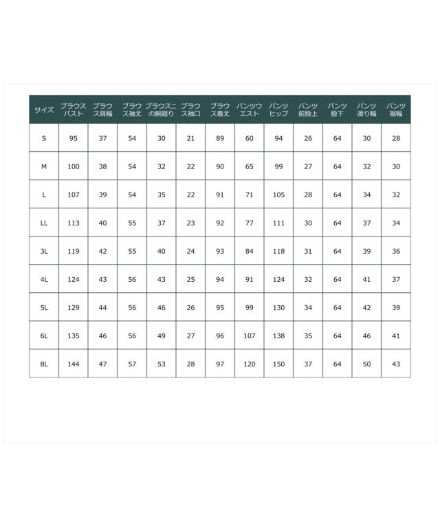 品質=[表地]ポリエステル100%(織物)[別布]ポリエステル100%(織物) [裏地]無 ブラウス:後ホック付ファスナー開 袖口ボタン開 両脇スリット パンツ:前ファスナー内ホック開 ウエスト後ゴム入 ポケット両脇 ※この商品は2点同サイズのみで販売します。 原産国:中国製(企画デザインは日本) 洗濯表示:洗濯機OK ネット使用